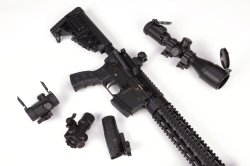 Nicht jedermann kann sich High End Optiken der renommierten Hersteller wie Aimpoint, EOTech, Leupold, Nightforce, Schmidt & Bender, Swarovski, Zeiss & Co. leisten, so dass auch für günstigere Produkte ein Markt vorhanden ist. Hierbei haben wir schon oftmals die Erfahrung machen dürfen, dass diese vergleichsweise billigen Optiken für den Schießsport durchaus brauchbar sein können. Für die Erprobung des M5 F standen uns zwei unterschiedliche UTG Leuchtpunktvisiermodelle „Tactical“ und „Combat“, ein dreifaches Vergrößerungsmodul, ein Zielfernohr SWAT 3-12x44 Compact EZ TAP sowie ein Zweibein in zwei Bauhöhen zur Verfügung.