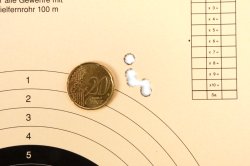 Die durchschnittliche Präzision aller Laborierungen lag bei 30,5 mm, wobei die Remington 55 Grains MC Fabrikmunition mit einem 102 mm Streukreis den Schnitt deutlich verschlechterte. Rechnet man diese Munition raus, ergibt sich eine Durchschnitts-Schussleistung von guten 20,3 mm. Noch besser wird es, wenn man nur die sechs 52 Grains Laborierungen werten würde, denn dann beträgt die durchschnittliche Schussleistung gerade einmal 17,8 mm.