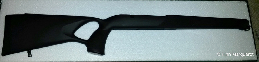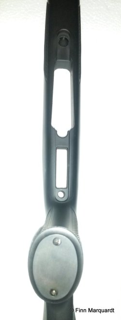 Oft wird im Zusammenhang mit Repetieren und Lochschäften der durch das "Einfädeln" des Daumens nach dem Repetiervorgang entstehende Zeitverlust aufgeführt. Dies kann ich klar verneinen. Es bedarf einer kleinen Umgewöhnung, doch ein messbarer Zeitverlust ist für mich nicht ersichtlich. Dank des sehr groß gehaltenen Durchgriffs gleitet der Daumen fast automatisch in die richtige Position, ganz ohne "einfädeln". Ich bin genauso schnell oder langsam wie ohne Lochschaft. Wer schnell im Anschlag repetieren kann, der wird mit einem Lochschaft genauso schnell sein. Die Gummischaftkappe ist sehr weich und dämpft den Rückschlag entsprechend gut ab.