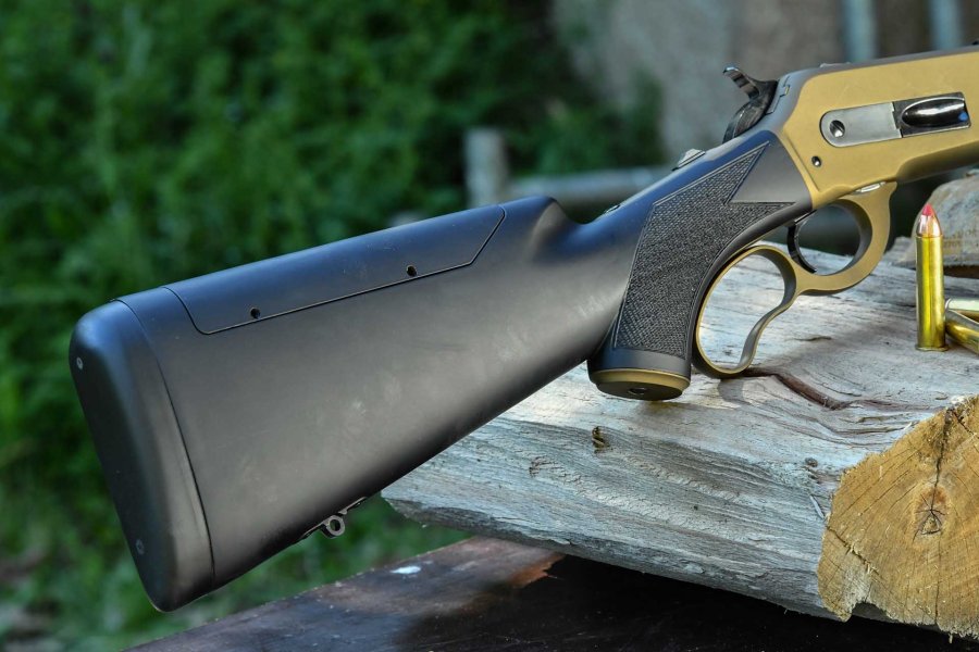 Der Hinterschaft besteht aus amerikanischem Nussbaum mit einem Soft-Touch-Überzug und schließt mit einer etwa 2 cm breiten Microcell-Gummischaftkappe ab. Der sehr schmale Pistolengriff ist zur besseren Haptik mit Verschneidungen/Fischhaut gearbeitet. Der ebenfalls schlanke Kolbenhals fällt sehr lang aus. Mittig auf dem Kolbenhals sitzt die Schiebesicherung. Der Bügel des Unterhebels präsentiert sich relativ klein für sehr große Hände – bei der Handhabung in der Drückjagd-Saison mit Handschuhen, könnte dieser zu eng sein. Der Abzug hat kaum Vorweg, arbeitet direkt und ohne kriechen. Das eher hohe Abzugsgewicht passt zum Einsatzzweck des Unterhebelrepetierers.