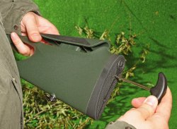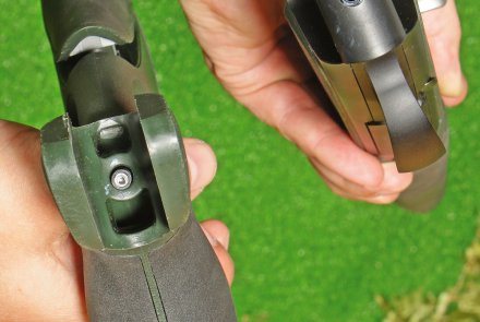 Die S 303-XT-Version kommt in Waldgrün. Sie besitzt griffige Elastomer-, sprich Gummieinlagen. Die greifen die leicht poröse Oberflächenstruktur des grünen Plastiks auf. Die gleichen Gummieinsätze finden sich am Pistolengriff und auf dem um rund vier Zentimeter stufenlos aus dem Kolben nach oben ausziehbaren Schaftrücken.