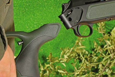 Dadurch, dass der Daumen der Schusshand im Schaftdurchbruch steckt, muss die Hand zum Betätigen des Spannschiebers auf dem Kolbenhals erst umgreifen.