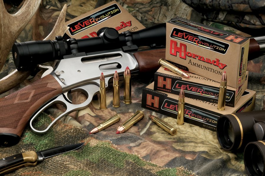 Außerdem gibt es noch eine vierte Waffe, die für die.450 Marlin eingerichtet ist: Die Steyr Mannlicher Big Bore. Diese Repetierbüchse wurde nahezu ausschließlich für die Nachsuche konstruiert. Allerdings wäre diese angesichts ihrer Eigenschaften ziemlich unpassend für den Zweck dieses Tests, der auf die Drückjagd ausgerichtet ist. Wie bereits erwähnt, stammt das Kaliber .450 Marlin aus zwei Händen. Es ist das Ergebnis einer Zusammenarbeit von Marlin und Hornady. Ziel war ein Kaliber, das leistungsstärker als die .444 Marlin und die alte .45/70 Gvt. war. Die beiden sind nur mit wenigen Laborierungen am Markt. Das zwingt den Nutzer zum Wiederladen. Das wiederum liegt für die meisten Leute außerhalb ihrer Möglichkeiten. Dieses mächtige Kaliber wurde auf der Shot Show 2000 zusammen mit dem 350-gr-Hornady-Geschoss aus der Custom Interlock Serie präsentiert. Bereits nach der fünften Saison folgte die legendäre LeverEvolution mit 325-gr-FTX-Geschoss. Diese Munition hatte großen Erfolg in den Vereinigten Staaten, speziell auf dem Markt für Jagdwaffen, vor allem bei Jagdführern, die sie zur Jagd auf wehrhaftes und Großwild verwenden.