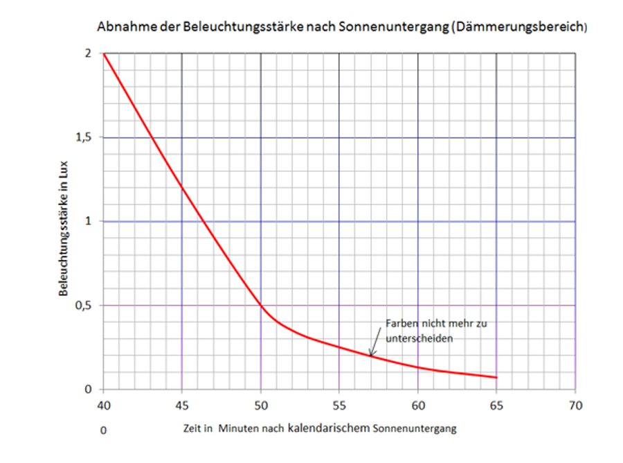 Die Abnahme der Beleuchtungsstärke kann im entsprechenden Diagramm abgelesen werden. Damit kann präzise festgelegt werden, was ist Dämmerung und was ist Nacht. Das Diagramm wurde aufgenommen ohne Fremdlichteinfluss von oben. Eine Wolkendecke in der Nähe einer gut beleuchteten Ortschaft kann die Werte beträchtlich verfälschen, da Licht an der Wolkendecke reflektiert wird. In mondloser Nacht kann das Ende der Dämmerung ca. 55 Minuten nach kalendarischem Sonnenuntergang erwartet werden. Farben sind dann nicht mehr zu unterscheiden, das Auge stellt um auf Schwarz-Weiß-Sehen mit geringerer Auflösung.