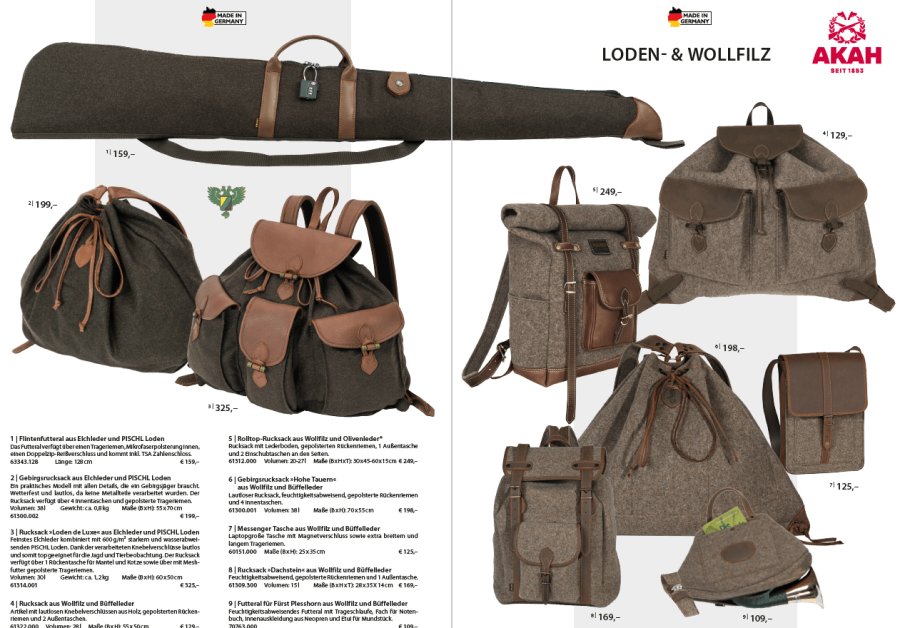 AKAH Loden & Wollfilz Rucksäcke, Futterale und Taschen: Traditionelle Jagdausstattung Made in Germany