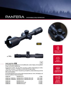 Die PARD Pantera-Serie umfasst hingegen vollwertige Wärmebildzielfernrohre, die ebenfalls noch nicht in Deutschland zugelassen sind, bei einer möglichen Legalisierung aber sofort einsatzbereit wären. Das PARD Pantera 256 Q mit 256×192 Sensor bietet einen preisgünstigen Einstieg in die Wärmebildzieltechnik für 799,- Euro. Die Modelle Pantera 480 Q und 640 Q mit 480×360 beziehungsweise 640×512 Sensor überzeugen durch thermische Empfindlichkeit von unter 18 mK, was die Erkennung feinster Temperaturunterschiede ermöglicht. Das hochauflösende 1600×1200 Display, der vergrößerte Objektivfokusring mit strukturierter Oberfläche und der magnetische Objektivdeckel könnten sich gerade bei der Pirsch als praktisch erweisen. Laser-Entfernungsmesser, ballistische Berechnung und eine Hot-Track-Funktion gehören zur Serienausstattung. Die PARD Pantera Serie ist bei AKAH ab 799,- Euro bis 3.999,- Euro (Pantera 640 Zoom) erhältlich.