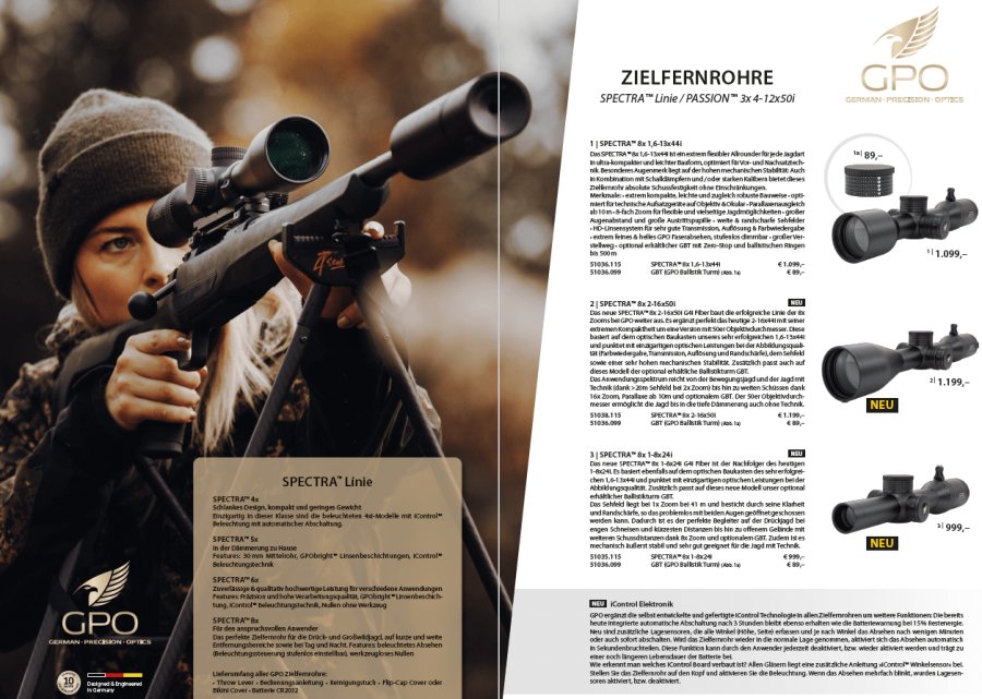 Die aktuellen GPO Spectra 8x Zielfernrohre 1-8x24i G4i und 2-16x50i G4i für die Jagd sind über AKAH verfügbar