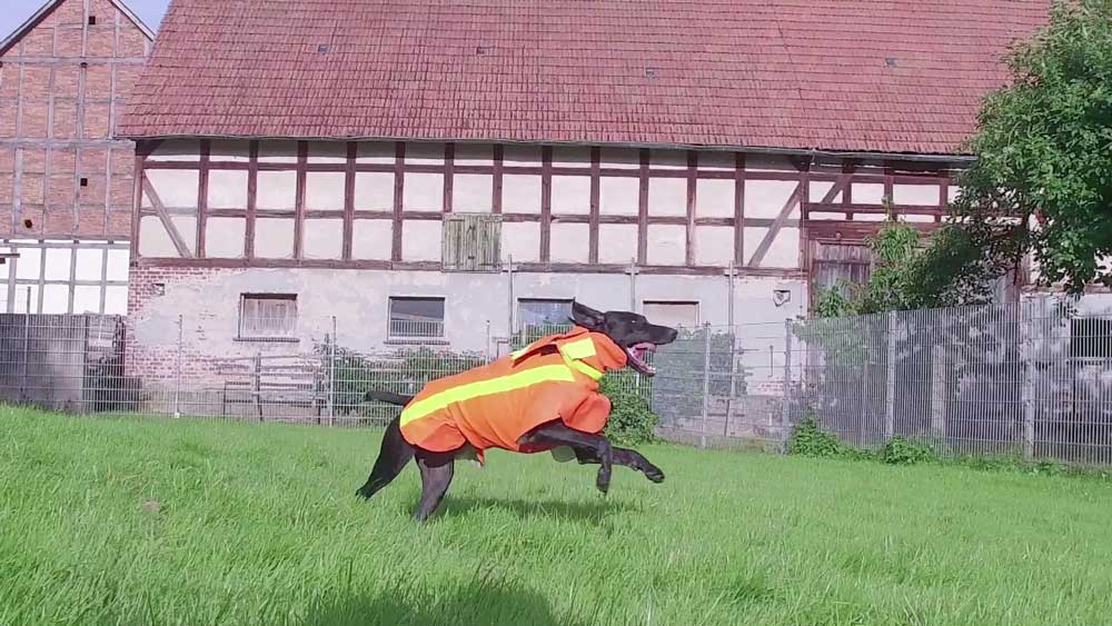 Durch das geringe Gewicht und dem atmungsaktiven Stoff haben die Hunde auch bei warmen Wetter im Sommer (z.b. bei Maisjagden) keine Probleme. Der größte Vorteil der Weste ist aber die Sicherheit und Robustheit.
