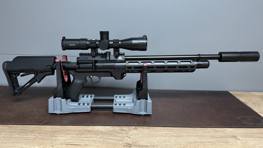 Das Ambi Tactical ist ein Pressluftgewehr, das mit einem Kartuschendruck bis zu 250 Bar arbeitet. Ein AirArms Regulator der Serie 7 sorgt dafür, dass die abgegebenen Schüsse extrem konstant sind. Das könnt ihr auch im Video beim Chronytest beobachten.
