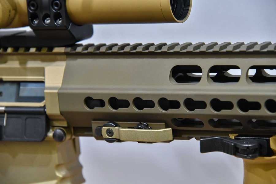 Der werkzeuglos abnehmbare Handschutz besitzt zwei NAR- und zwei KeyMod-Schnittstellen. Ideal zum Anbringen von Zubehör wie Licht- und Lasermodulen oder Zweibein und Frontgriff. Die beidseitige 60 Grad-Sicherung wirkt auf den Schlagbolzen.