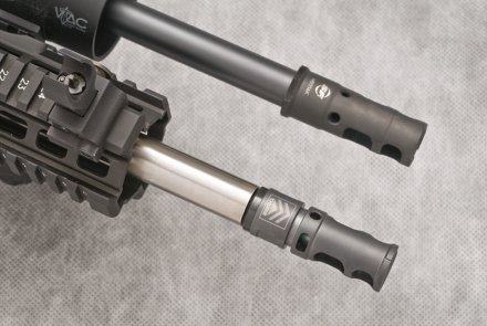 Für den Praxistest setzten wir den THUMB BirdCAGE556 mit 1/2-28 TPI UNEF Gewinde auf ein modifiziertes SIG Sport 551. Die THUMB TwistFORK556 und THUMB VAULT556 Kompensatoren, jeweils mit M14x1 Gewinde, wurden auf einem OA-15 mit 16,75" Lauf, "Midlength" Gassystem und ARS II Handschutz mit verdeckter Gasentnahme von Oberland Arms getestet.