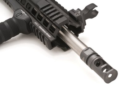 Als Referenz-Kompensator kam ein SureFire MB556K ebenfalls auf einem AR-15 mit 16,75" Lauf und "Midlength" Gassystem zum Einsatz, denn den SureFire Kompensator kann man in seiner Gesamtleistung ohne Übertreibung als den "Goldstandard" der aktuell verfügbaren 5.56 Mündungsbremsen bezeichnen.