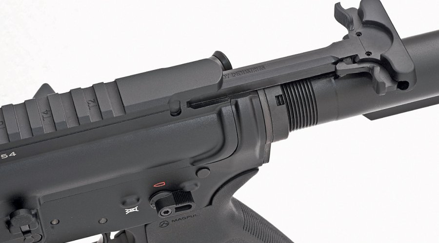 Beim VTAC Schmeisser AR-15 M5F ist der Durchladehebel des US-amerikanischen Herstellers Troy ebenso wie die Sicherung von Hera Arms beidseitig bedienbar.