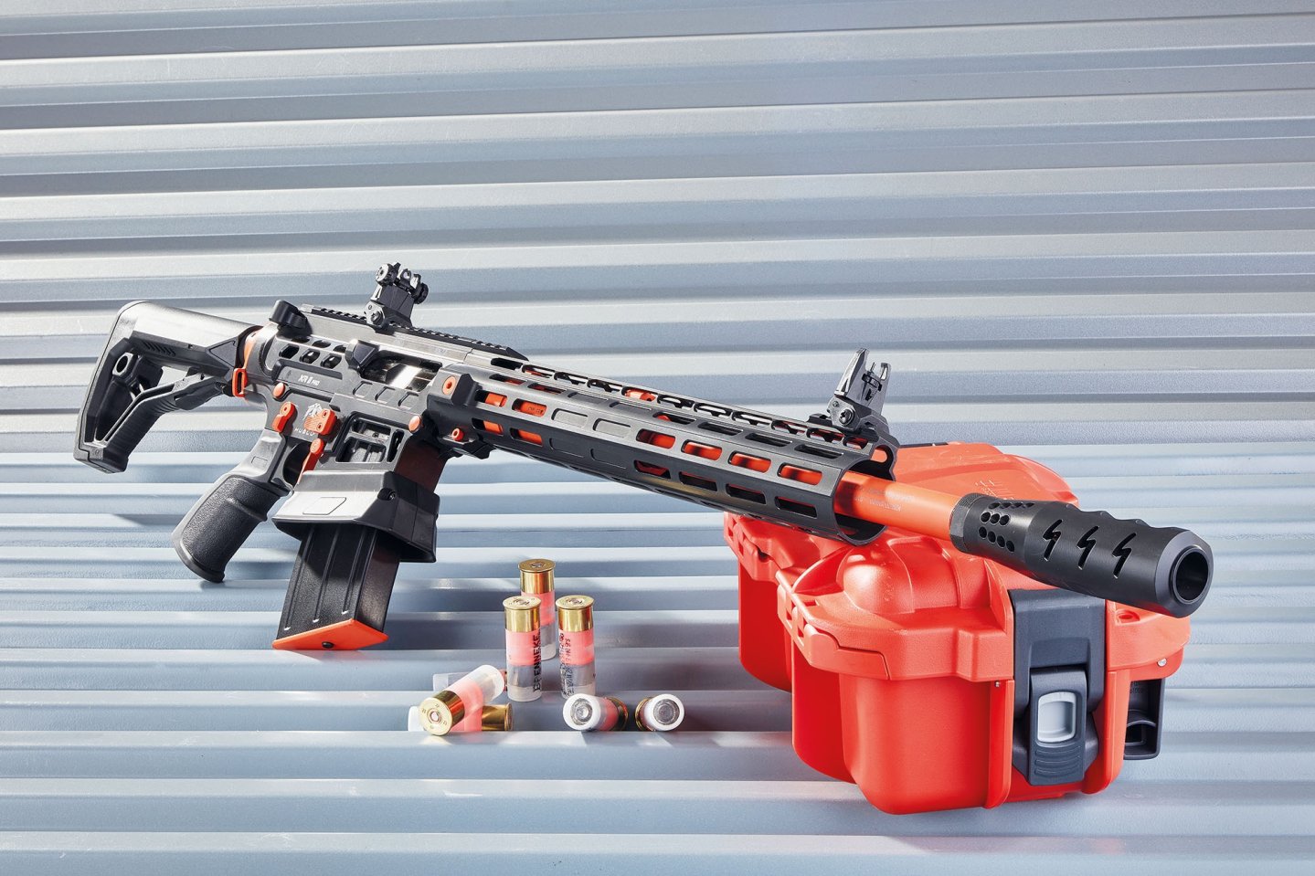 Diese Huglu XR-8 arbeitet als Gasdrucklader, unterscheidet sich aber deutlich von vielen anderen Flinten mit Kastenmagazin im AR-15-Style und das, obwohl inzwischen die meisten hierzulande erhältlichen Flinten mit Kastenmagazin auch aus der Türkei kommen dürften, was nicht zuletzt auch einen Beleg für die Innovationsfreude der dortigen Hersteller darstellt. Allerdings ist hier nicht alles Gold was glänzt. Ein häufiges Problem stellen zügige Magazin-Wechsel dar. Bei fast allen Testwaffen, die uns in den vergangenen Jahren in die Finger kamen, musste beim Entnehmen des Magazins stark nachgeholfen werden, teilweise mit sehr hohem Kraftaufwand. Nur bei einer einzigen Flinte im AR-Design fiel das Magazin beim Betätigen des Magazindrückers frei aus dem Schacht, wobei dies eine Grundvoraussetzung für eine erfolgversprechende Teilnahme an IPSC-Wettbewerben darstellt.