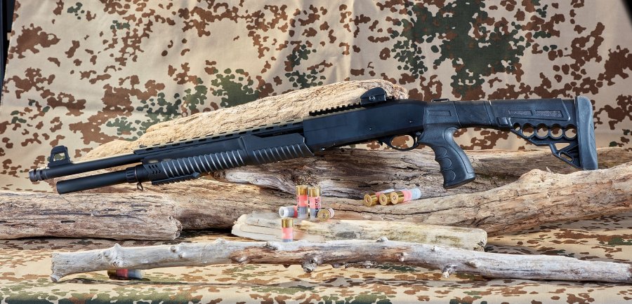 Ausstattung: Schwenkriegel-Verschluss, Leichtmetallgehäuse mit Picatinny-Schiene und abnehmbarer Kimme, Wechsel-Chokes, Ghost Ring Sight, Teleskop-Schaft. |