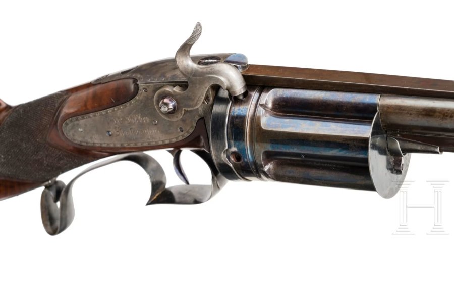 Am Systemkasten sitzt ein rechtsseitiges Hahnschloss mit rückliegender Feder. Der Hahn weist einen feinen Haarriss auf. Auf der Schlossplatte findet sich die Marke "J.C. Fischer Schaffhausen". Das Gewehr hat einen dunklen, lackierten Nussbaumschaft mit ausgeprägter Maserung, der mit einer deutschen Backe und einer fein geschnitten Fischhaut aufwartet. Nach hinten abgeschlossen wird der Schaft von einer stählernen Kappe, zudem ist er mit Riemenbügeln bestückt. Der Ladestock wurde nachträglich angefertigt. Bei diesem System muss die Trommel nach Spannen des Hahns in die Sicherheitsrast kräftig nach hinten Richtung Stoßboden gezogen werden, damit sie manuell weitergedreht werden kann und dann federbelastet wieder nach vorne gedrückt wird und einrasten kann. Diese Rarität ersten Ranges wurde leicht überarbeitet. Johann Conrad Fischer (Schaffhausen, 1773-1854) hatte laut "Der Neue Stöckel", Band 2, Kontakt zu bedeutenden europäischen Büchsenmachern. Er soll Samuel Pauly und Henri LePage in Paris sowie Joseph Egg in London aufgesucht haben. Bei diesem Los handelt es sich um eine absolute Seltenheit, die sich in ausgezeichnetem Zustand befindet. Weitere ähnliche Exemplare sind derzeit nicht bekannt. Der Startpreis liegt bei 6.800,- Euro.