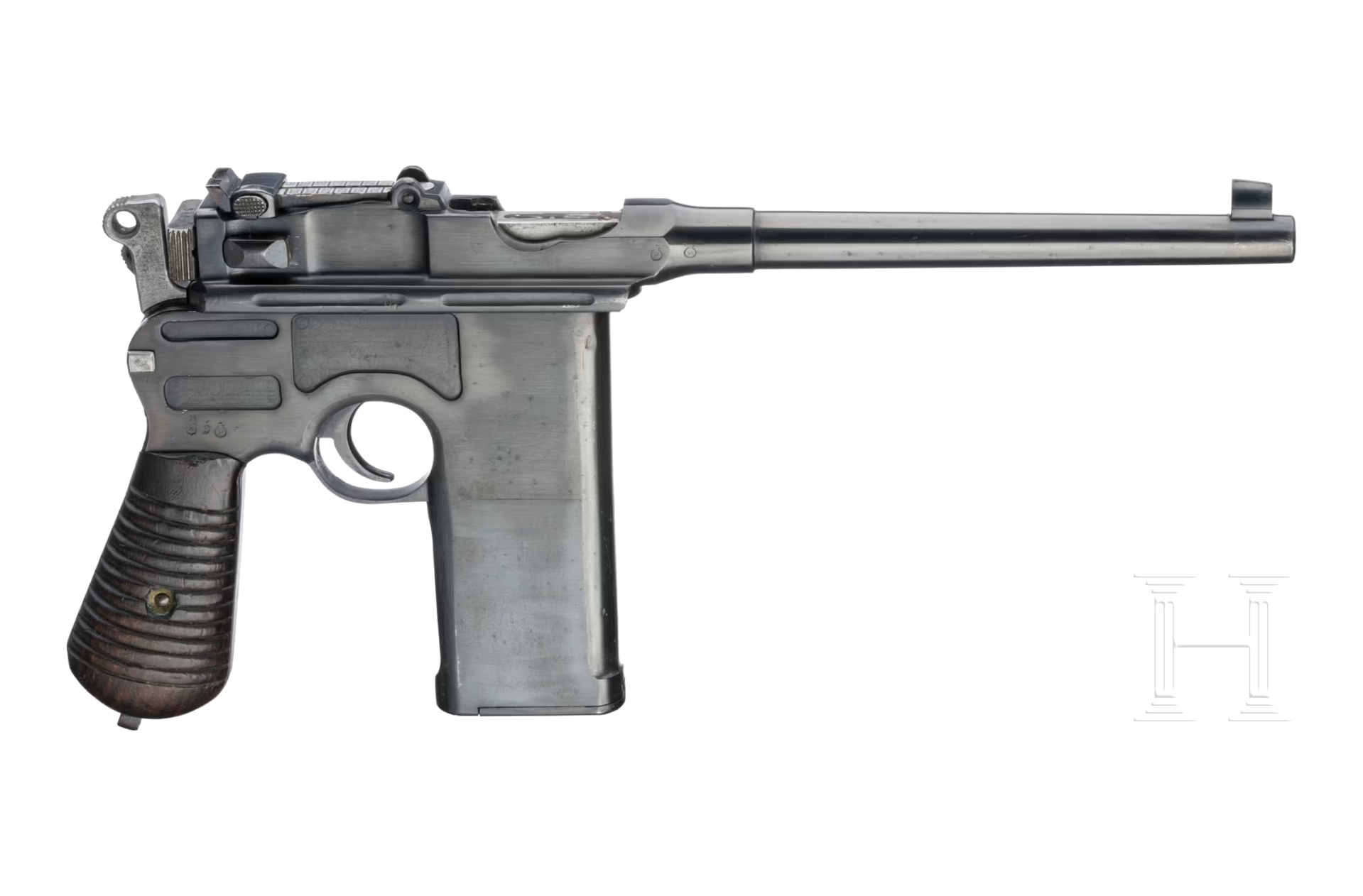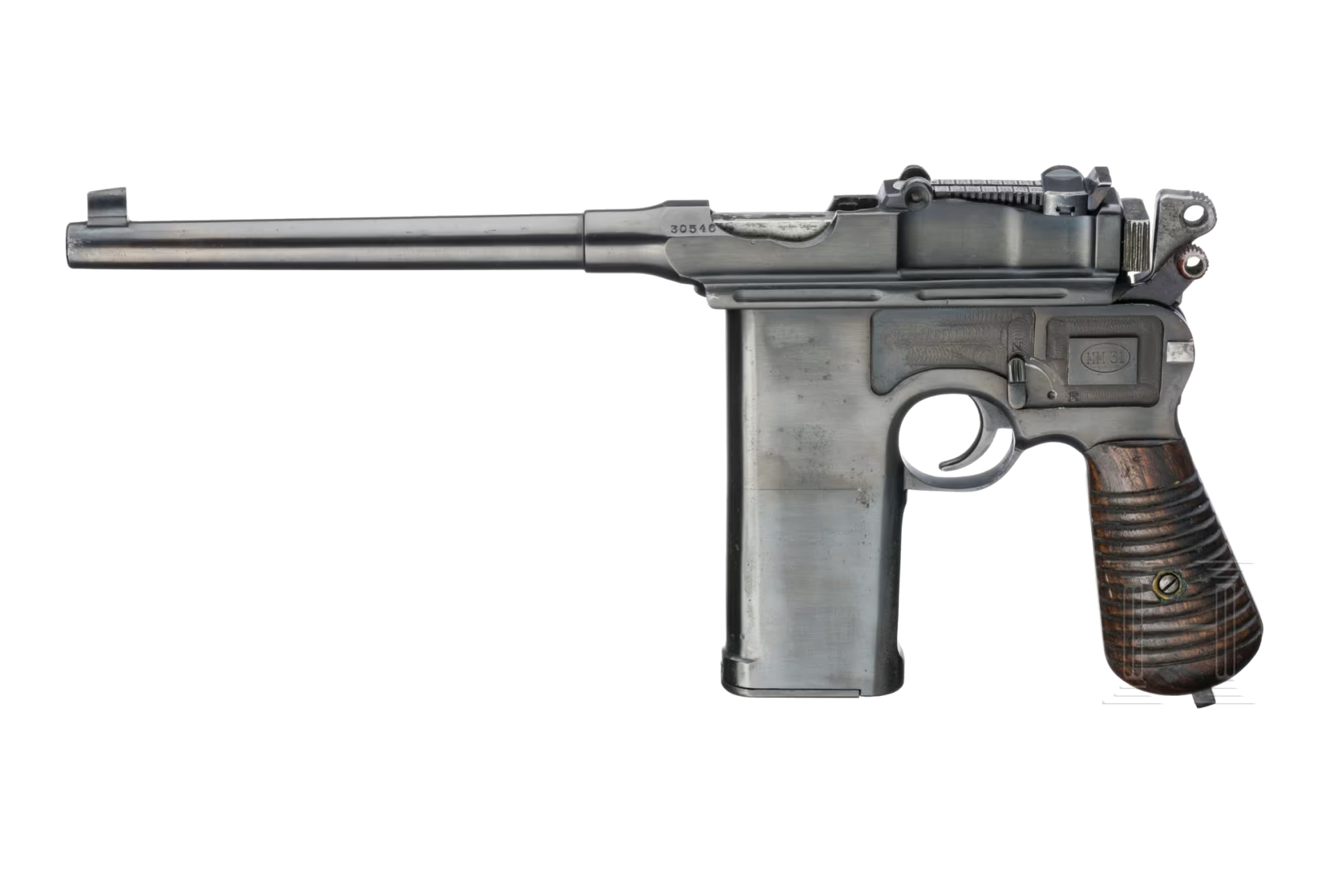 Los 3046 ist ein interessantes Beispiel für die baskischen Produktionen, die von der Mauser C96 inspiriert wurden und typisch für die Zeit zwischen den beiden Weltkriegen sind. Die Beistegui Royal MM 31, zweite Version, ist eine in Spanien hergestellte halbautomatische Pistole im Kaliber 7,63 mm Mauser, mit der Seriennummer 30546 auf allen wichtigen Teilen, einschließlich der Griffschalen. Es handelt sich um die Variante mit einem 20-Schuss-Magazin. Der 180 mm lange Lauf hat eine matte Oberfläche, das starre Korn wird hier von einer verstellbaren Schiebekimme ergänzt, die von 50 bis 1000 Meter eingestellt werden kann, wie man es auch von der Mauser C96 her kennt. Der Beschussstempel stammt aus dem Jahr 1931. Auf der linken Seite des Laufs erscheint als einzige Markierung der Schriftzug "MM 31" in einem Oval, was auf das Militärmodell von 1931 hinweist; die Waffe wurde bei Beistegui Hermanos in Eibar hergestellt. Die Pistole ist wahrscheinlich schon einmal neu brüniert worden und weist an manchen Stelle feinste Flecken auf, während der Hahn und das Gehäuse grau gebeizt wurden. Die dunkelbrauen Nussbaumgriffschalen besitzen Querrillen. Der Fangriemenring ist nicht mehr vorhanden und die Reihenfeuerfunktion wurde deaktiviert. Der Startpreis beträgt 1.900,- Euro.