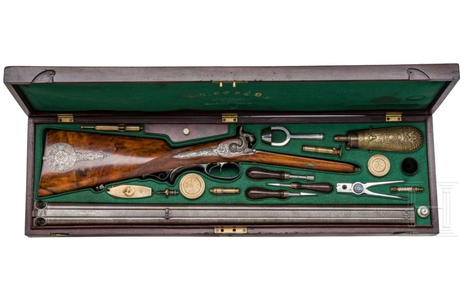 Lebeda spezialisierte sich auf die Herstellung von kombinierten Jagdwaffen mit einem glatten und einem gezogenen Lauf, die nebeneinander (wie in diesem Fall) oder übereinander angeordnet werden konnten. Seitenplatten, Hähne, Läufe, Abzugsbügel und Patchbox zieren feine Gravuren mit zarten floralen Mustern und Tiermotiven. Der Schaft besteht aus lackiertem, hellem Nussbaumholz mit Fischhautverschneidungen und weist ein langgezogene deutsche Backe auf. Riemenbügel und Ladestock sind am Schaft respektive Lauf angebracht. Das Gewehr verfügt über einen Doppelabzug mit Rückstecher im vorderen Züngel. Der originale dunkle Holzkoffer beherbergt ein komplettes Zubehörsortiment wie etwa Locheisen, Kapselsetzer, Pulverflasche und -maße sowie Kugelzange. Das Innere des Koffer ist mit grünem Stoff ausgekleidet und mit passgenauen Fächern für die Waffen- und Zubehörteile versehen, im Deckel ist in Gold die Aufschrift "A.D. Lebeda k.k. landesbefugter Gewehrfabrikant in Prag" aufgeprägt. Der Startpreis lag bei 2.500 Euro, doch der Zuschlag erfolgte schließlich bei 7.400 Euro.
