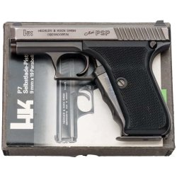 Los 2136 führt uns zurück nach Deutschland, wo Sammler heiß auf Heckler & Koch-Pistolen sind, die in den 1970er und 1980er Jahren hergestellt wurden. Hier handelt es sich um eine halbautomatische H&K PSP im Kaliber 9 Luger, mit der Seriennummer 165 in der Originalschachtel. Die Pistole trägt deutsche Beschussmarken von 1978. Auf der linken Seite des Schlittens ist der Firmenname zweizeilig eingraviert, auf der rechten Seite die Angabe des Kalibers, die Seriennummer und der Beschussstempel. Die originale Hochglanzbrünierung ist komplett intakt, die Griffschalen bestehen aus schwarzem Kunststoff. In der originalen, nummerngleichen und nur leicht beschädigten Pappschachtel befinden sich die Anschussscheibe, Bedienungsanleitung, Werkzeug und Putzstock. Hinzu kommen fünf Ersatzmagazine. Zum Startpreis von 1.600 Euro angeboten, brachte diese interessante halbautomatische Pistole in fast neuwertigem Zustand den Hammer des Auktionators erst bei der beachtlichen Endsumme von 9.000 Euro zum Zuschlagen, mehr als das Vierfache des ursprünglichen Preises. Dies zeigt uns, dass das Sammelfieber für die H&K PSP und P7 zumindest in Deutschland immer noch vorhanden ist.