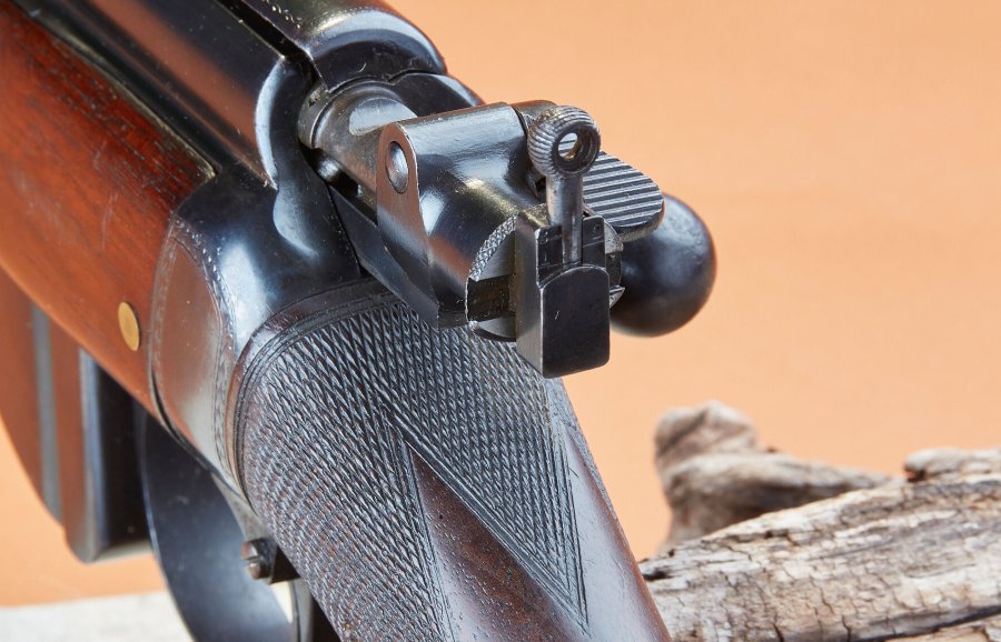 | Ausstattung: | Magazinsperre, zweiteiliger Nussbaumschaft, Expresskimme und Schlösschen-Lochdiopter, Direktabzug, Stahl-Schaftkappe, Staubschutzdeckel. |