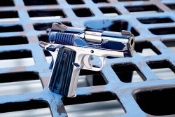 Mit der handlichen 3“-Version offeriert KIMBER ein Liebhaberstück, das für das ständige verdeckte Tragen schon fast zu schade erscheint. Die Kompaktpistole in 9 mm Para erhielt zwecks Gewichtsersparnis ein leicht gekürztes Duralgriffstück. Für das Auge spendierte der Hersteller den Stahlteilen ein leuchtend blaues PVD-Finish. Und der Schlitten kommt mit dezenter Randgravur.