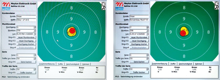 Nicht zuletzt hat VISIER technologisch aufgerüstet: In Zeiten von nur knapp über dem Kaliberdurchmesser liegenden Schussbildern genügen einfache, ausgefranste Löcher in Scheibenkartons eben nicht mehr zur Analyse. Das Meyton-System „BallMan“ wertet die Schüsse elektronisch aus und gibt die Koordinaten der Trefferlage bis aufs Hundertstel genau an. Und schon taucht man statt in ein grobes, diffuses Schussloch in eine grafische Darstellung, die sowohl den tatsächlichen Mittelpunkt der Zehn-Schuss-Gruppe wie auch die Lage jedes einzelnen Treffers speichert.