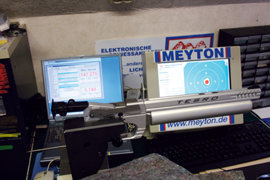 Wolfgang Müller, ehemaliger Nationalteam-Schütze und mehrfacher, auch internationaler Titelträger, ist seit Jahren die „Institution“ für Matchwaffen-Tests, die gemeinsam mit VISIER durchgeführt werden. Bei ihm läuft neben der BallMan-Anlage auch ein modifiziertes Geschwindigkeits-Messgerät BMC 17 von EFK Mehl mit, um Auswirkungen von Schwankungen bei der Anfangsgeschwindigkeit v1 auf die Trefferlage zu entdecken.