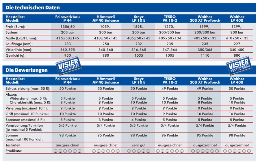 Die dem gestiegenen Leistungsvermögen der Matchwaffen angepassten Testkriterien wurden Punkt für Punkt abgearbeitet. Dabei gab es auch einige Veränderungen zu vorherigen Tests. Denn auch Serienwaffen sind oft unterschiedlich, was Einstellungen und Verarbeitung angeht. Etwa bei den Visierungen: Als erstmals die besten Pistolen der Welt in einem Test zusammentrafen, errang hier keine die vollen zehn, sondern alle nur neun Punkte.
