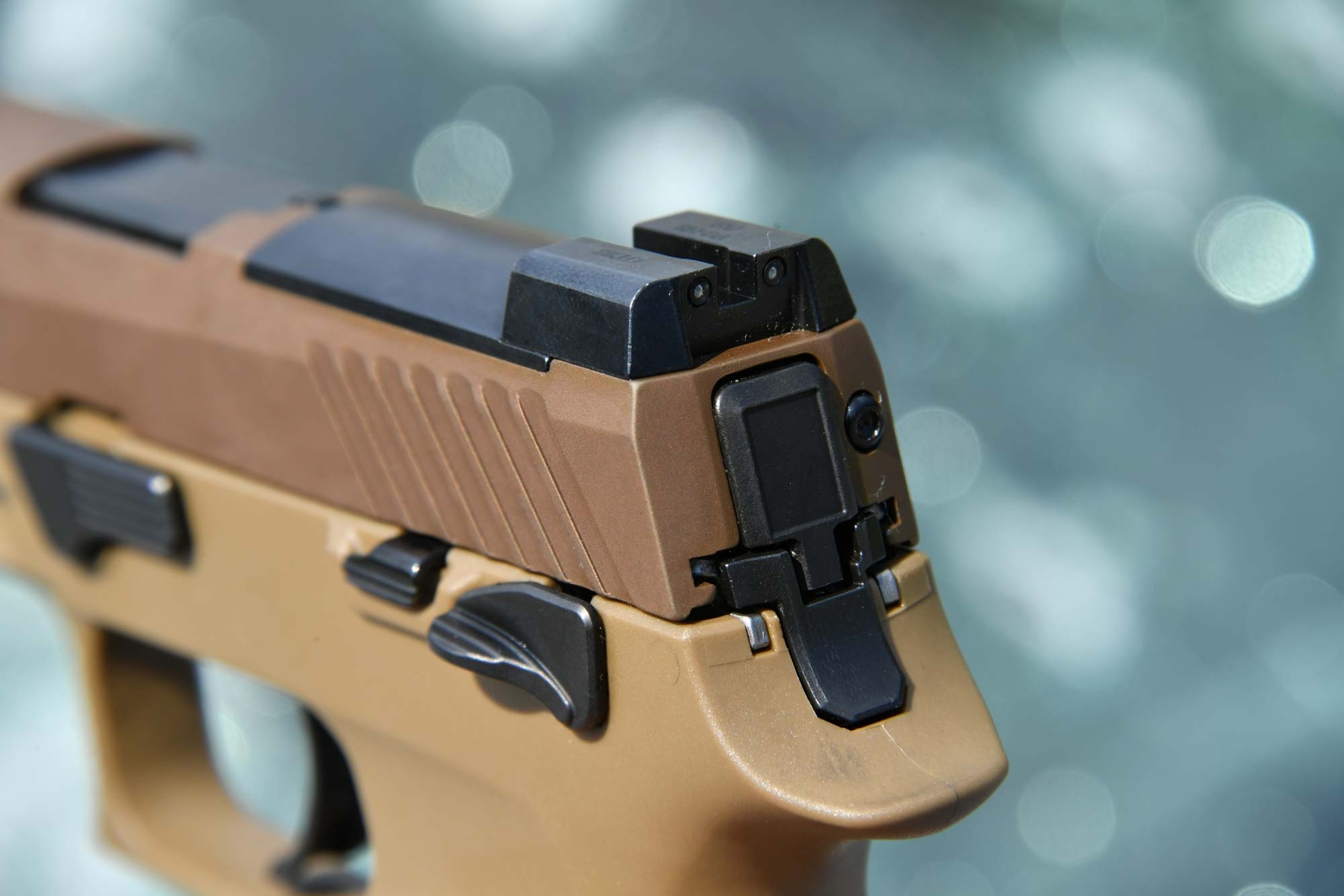 Die originale M17 Dienstpistole scheint ebenso wie ihre neuen Zivilausführungen äußerst präzise zu sein. So waren wir in der Lage, in der SIG Sauer Academy mit der P320-M17 und standardmäßiger SIG Sauer Elite Performance Fabrikmunition mit 115 Grains Vollmantelgeschoss mit 4 von 5 Schüssen eine 40 cm Stahlplatte auf 75 m zu treffen!