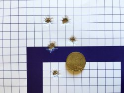 Mit den GECO-Vollmantelpatronen stanzte die SFx ihren engsten Streukreis auf die Prüfscheibe: 63 mm Durchmesser. Den Sellier & Bellot-Laborierungen vermasselte ein einzelner Ausreißer ihr 52-mm-Ergebnis.