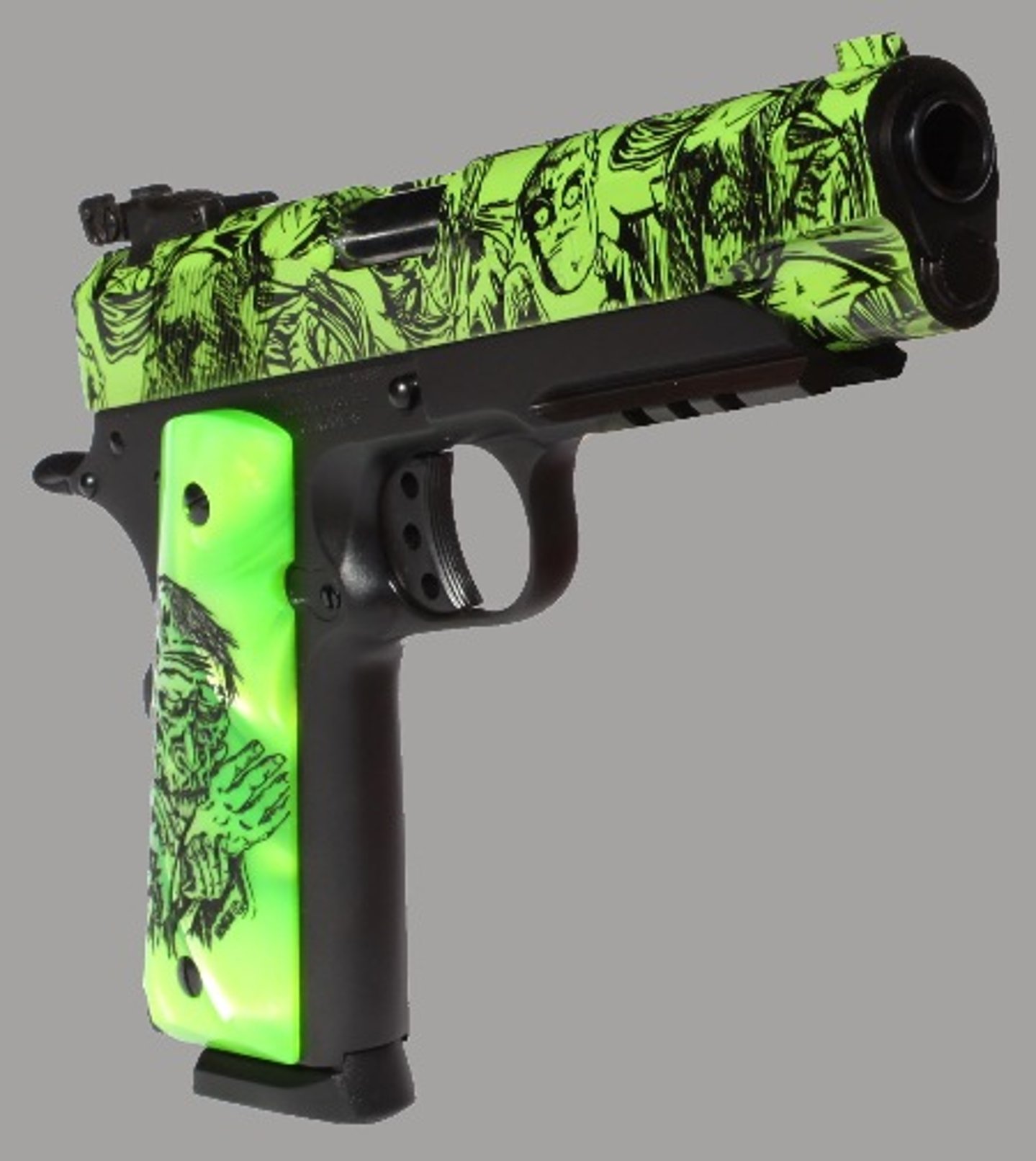 "Zombies sell" könnte man glauben, wenn man auf die Produktpaletten von diversen US-Herstellern von Waffen, Optik und Munition blickt. Dass der Trend aber immer noch anhält, sieht man am neuesten Mitglied der Iver Johnson Arms Familie. Der klassische 1911er-Klon im Kaliber .45 ACP kommt mit giftgrünem Schlitten und Griffschalen. Die Zombie-Motive darauf sind eingraviert und mit Klarlack überzogen. Zusätzlich kommt die Eagle LR Zombie mit allem Zubehör,