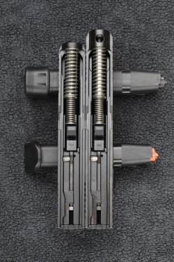 Das bringt uns zum zweiten Punkt, der Austauschbarkeit der Teile. Nun kann die kürzere Tandem-Verschlussfeder der G19 zur Anwendung kommen. Da Verschlussfedern Verschleißteile sind und die CBP über die ganzen USA verstreut ist, kann man verstehen, warum auf Teilekompabilität verstärkt Wert gelegt wurde.