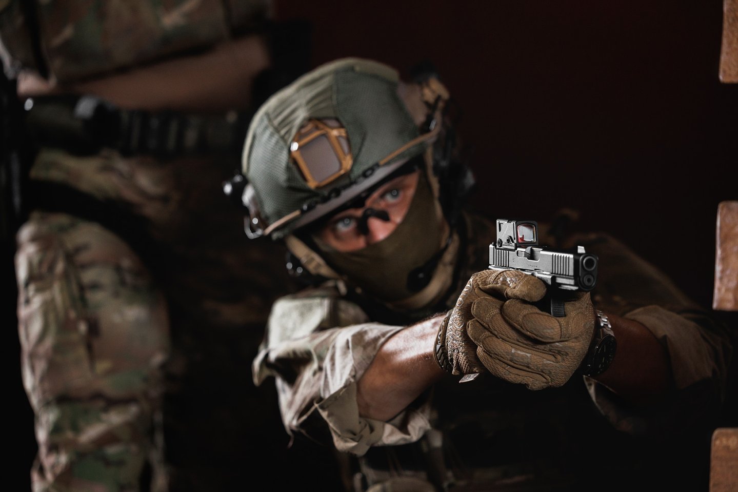 All diese neuen Waffen und auch das Weißlichtmodul konnten wir auf dem Hausschießstand von GLOCK unter Anleitung des taktischen GLOCK-Schießausbildungsteams, das ausschließlich aus ehemaligen Mitgliedern des österreichischen Jagdkommandos besteht, im Feuer erproben. Mir persönlich haben vor allem auch die GLOCK G47 und G45 A-CUT-COA-Pistolen gefallen, weil ich ausgewachsene GLOCK-Modelle und ihre Handhabungseigenschaften bevorzuge. Eine schnelle Zielerfassung und akkurate Trefferplatzierungen waren auf Nahdistanzen auch unter widrigen Lichtverhältnissen und selbst beim Tragen eines Ops-Core-Helmes mit Nachtsichtbrille in völliger Dunkelheit stets gewährleistet. Es konnten fixe Doubletten gefeuert werden, wobei der Leuchtpunkt kaum aus dem großzügig bemessenen Sichtfenster des Aimpoint COA wanderte. Das Visier macht, wie erwähnt, auch auf den kompakten Slimline-Pistolen eine erstklassige Figur.