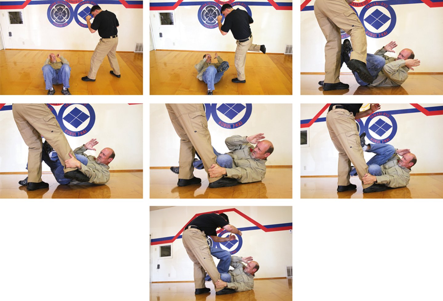 Tritt er langsamer zu oder nutzt eine sehr weite Ausholbewegung bevor er zutritt, warten wir nicht, sondern feuern direkt einen Kick gegen das Knie oder den Fußknöchel seines Standbeines ab. Nähert sich ein Angreifer von der Seite und versucht uns in die Rippen oder gegen den Kopf zu treten, heben wir unser Knie auf der Angriffsseite an, stellen Kontakt zu unserem Ellbogen her und drücken die Handfläche gegen den Kopf, um den bereits erläuterten "Rahmen" von Kopf bis Fuß herzustellen. Kurz bevor der Tritt des Angreifers auf uns einwirken kann, rollen wir ihm entgegen und stoppen mit unserem Rahmen einen Großteil seiner Wucht. Nach dieser Abwehr umklammern wir mit unserer Hand sofort seinen Fuß und halten ihn auf dem Boden gefangen.