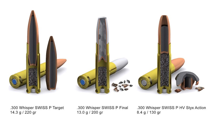 Die Standardpatrone der Whisper Familie ist die .300 Whisper SWISS P Target 14.3 g / 220 gr, die seit über 10 Jahren von der RUAG in der Schweiz hergestellt wird. Das verbaute HPBT-Geschoss ist form- und massestabil, da es nur im Unterschallbereich (320m/s) fliegt. Dies macht die Patrone umso leiser, weil dabei kein Überschallknall entsteht, welcher bei Überschallpatronen auch mit einem Schalldämpfer nicht verhindert werden kann. Diese Patrone eignet sich besonders für Training, den Scharfschützeneinsatz im urbanen Gelände oder den infanteristischen Einsatz, welcher schallgedämpft ausgeführt werden muss.