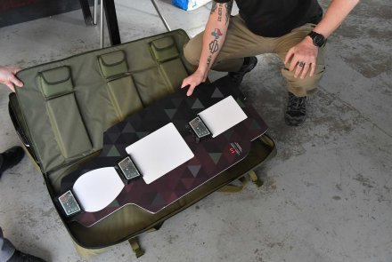 Darüber hinaus gibt es aber auch eine nicht für den zivilen Markt zugängliche Law-Enforcement-Produktlinie, die der Ausbildung von professionellen Anwendern, also etwa Militär und Polizei, gewidmet ist. In diesen Sektor gehört auch das System "CQB in a box", das unsere Redaktionskollegen in Italien eingehend testen konnten. CQB ist die gebräuchliche Abkürzung für Close Quarters Battle, also Nahkampf im Wortsinn "auf kurze Distanz", und auch das "in a box" ist dabei wörtlich zu nehmen, denn die komplette Trainingseinheit passt in eine kompakte Nylontasche, die sich leicht transportieren lässt, so dass man das Set überall, selbst auf kleinstem Raum, aufbauen kann.