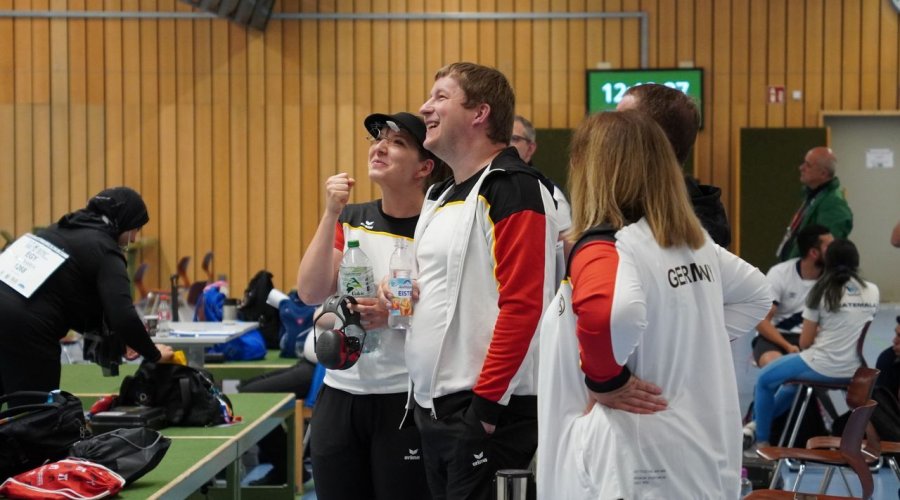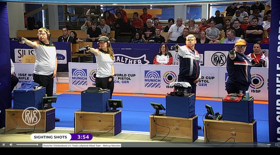 Wieder aus dem Pistolenlager kam auch die letzte, vierte DSB-Medaille, als das Luftpistolen-Mixed-Duo Doreen Vennekamp und Christian Reitz (in seinem immerhin dritten Weltcup-Start in München) im Bronzematch antrat und es mit keinen Geringeren als den Olympiasiegern von Paris 2024 zu tun bekam, den auch aus der Bundesliga gut bekannten Serben Zorana Arunovic und Damir Mikec. Die Führung (16 Punkte müssen zum Sieg erreicht werden) wechselte ständig hin und her, bevor die zwei deutschen Luftpistolen-Schützen zum „Olympiasieger-Besieger“ wurden.