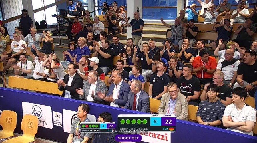 Dennoch sollte es an den Abschlusstagen noch weiteres Edelmetall für das DSB-Team geben: Zwar verpasste ausgerechnet Christian Reitz, der Olympiasieger von Rio 2016, mit sehr guten 586 Ringen das Finale um einen Ring. Oliver Geis auf Platz 15 und Fabian Otto auf Platz 17 rundeten das starke Teamergebnis in der besten deutschen Disziplin ab. Viel höher rangierten aber zwei weitere DSB-Stars: Florian Peter, schon bei Olympia 2024 Vierter und überraschend Emanuel Müller schafften es ins Finale der besten sechs, wo sie zunächst den Koreaner Sukjin Hong und den Chinese Lianbofan Su abhängen konnten. Gegen die französischen OSP-Spezialisten Clement Bessaguet, immerhin Welt- und Europameister, und Jean Quiquampoix (Olympiasieger 2024) kämpften sie stark: Zunächst konnte Müller mit zwei Fünf-Treffer-Serien die Bronzemedaille gegen Bessaguet sichern, bevor Florian Peter gegen den nervenstarken Quiquampoix mit 32:35 Treffern unterlag, aber Silber errang.