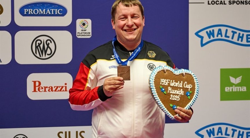 Direkt zum Auftakt am 10. Juni hatte Christian Reitz ein Ausrufezeichen für das Team das Gastgeberlands gesetzt: Der Routinier aus Regensburg gewann mit der Luftpistole nach einem spannenden Finale die Bronzemedaille – es war, sage und schreibe, seine 44. Weltcup-Medaille. Wie alle Medaillengewinner erhielt er neben dem Edelmetall auch das als Mitbringsel begehrte Lebkuchenherz. Im Wettbewerb mit dem Luftgewehr der Frauen zeigte Anna Janßen (Freising) mit 632,9 Ringen eine sehr gute Leistung, die wegen der ultrastarken Konkurrenz leider nur mit Platz zehn belohnt wurde. Überhaupt fehlte bei allen DSB-Gewehrschützen auch an den Folgetagen des vielleicht ab und zu wichtige Quentchen Glück: Maximilian Ulbrich als Zwölfter mit dem Luftgewehr und Anna Janßen als 20. im KK-Dreistellungskampf waren die am besten platzierten Deutschen.