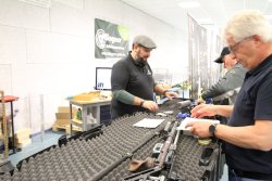 Lange Schlangen gab es auch bei den Dienstleistern auf der DM, die am Samstag schon bald "nichts geht mehr" verkünden mussten: Bei Gernot Eder am Feinwerkbau-Stand wurden schon mittags keine neuen Luftgewehre zur (kostenlosen!) Service-Überprüfung mehr angenommen. Auch bei Optiker Arno Kütemeyer, der Schießbrillen für das Schützenzentrum Klingner (Bremervörde und Hannover) anpasst, gab es keine Termine mehr für eine Schießbrillen-Beratung – gute Arbeit braucht eben ihre Zeit. Auch die Service-Teams von Anschütz, Carl Walther und Steyr Sport konnten sich über mangelnde Nachfrage nicht beklagen, denn viele Schützen nutzen die Meisterschaft zum jährlichen Check ihrer Sportwaffen.