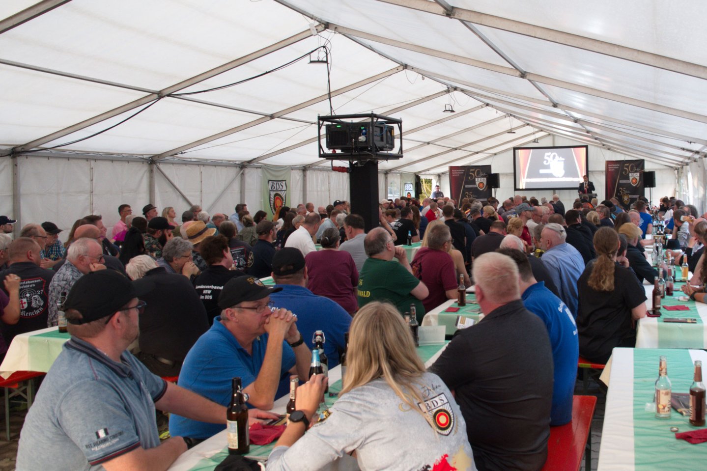 Am Festabend im großen Festzelt nahmen neben knapp 300 BDS-Mitgliedern auch Ehrengäste der anderen deutschen Schießsportverbände sowie IPSC Präsident Vitaly Kryuchin und der Bürgermeister der Stadt Philippsburg, Stefan Martus, teil. In seiner Festrede erinnerte BDS Präsident Friedrich "Fritz" Gepperth an seine Anfänge im BDS vor fast 40 Jahren als der Verband noch „etwas über 3.000“ Mitglieder hatte. Der BDS war entstanden, weil es eine Lücke im schießsportlichen Angebot in Deutschland gab: Großkaliberschießen mit Lang- und Kurzwaffen. Seitdem ist der Verband kontinuierlich gewachsen, sodass vor zehn Jahren zum 40-jährigen Jubiläum die Marke von 50.000 Mitgliedern überschritten und zwischenzeitlich in pucto Mitgliederzahl sogar die Schwelle zur 100.000 durchbrochen wurde. Laut Gepperth liegt das in erster Linie an den beiden vom BDS praktizierten Prinzipien „Sportschießen mit Vergnügen“ und „Sportschießen für Aktive“. Daher wurde und wird die Sportordnung immer an die Bedürfnisse und Interessen der Schießsportler angepasst. Die Mitglieder seien auffallend aktiv und beteiligten sich sehr stark am Wettkampfsport.