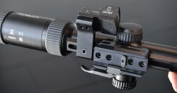 Ebenfalls neu und bei EAW bereits in Serie für diverse Red Dot-"Fußabdrücke" lieferbar: Eine clevere kleine Adapterschiene, mittels derer sich Mini-Reflexvisiere (Min Red Dot Sight – MRDS) von unten in einer Zeiss-Innenschiene als Back Up-Zieloptik am Zielfernrohr befestigen lassen. Die Abbildung zeigt ein Noblex-Zielfernrohr in der Version mit Zeiss-Innenschiene. Darunter montiert eine ultrakompakte Schnellverschluss-Montage für Picatinnyschienen aus dem Hause EAW und direkt dahinter die Z-Rail-Adapterschiene von EAW. Darauf sitzt auf der Abbildung ein MRDS in Form eines Docter-Sights.