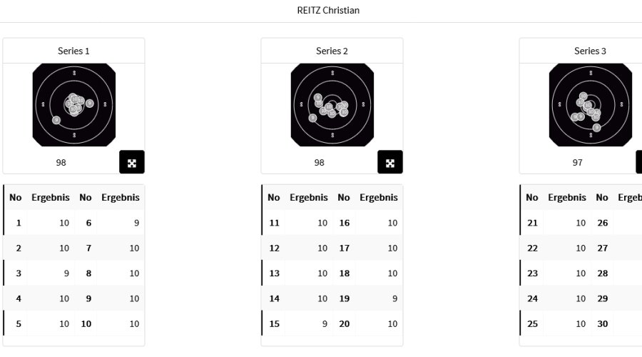 Die offizielle Ergebnisliste der Herren wird morgen um die Resultate von der zweiten Wettkampfhälfte ergänzt, danach stehen die sechs besten Vorkampfschützen als Finalisten fest.