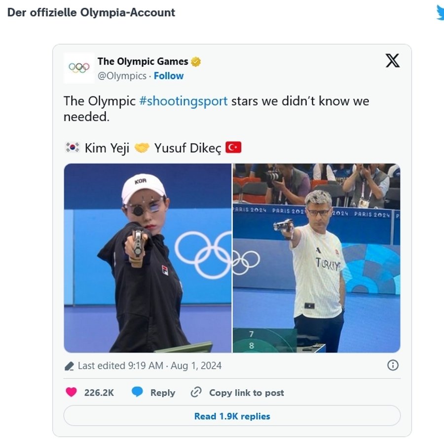 Unverhofft kommt oft: Yusuf Dikec ist vielen Schießsport-Fans seit Jahren bekannt. Er war zweimal ISSF-Weltmeister mit der Zentralfeuer- und der Standardpistole, hat auch schon einen Weltcup mit der Luftpistole gewonnen. Mit Teamkollegin Servan Tarhan gewann er jetzt Silber im Mixed-Wettbewerb mit der Luftpistole, und sein Bild ging um die Welt. Und schon taucht er im Internet als "Turkish Dad" und der vielleicht coolste Schütze bei Olympia auf, als modischer Gegenpol zur Koreanerin Kim Yeji (31), die im Luftpistolen-Match (wo sie Silber gewann) mit einer für Laien futuristisch anmutender Schießbrille, Ringen an den Händen und einem Stofftier an der Seite antrat, das sie in den Schießpausen knuddelte. Auch das Lifestyle-Magazin GQ portraitierte die koreanische Sportlerin.