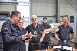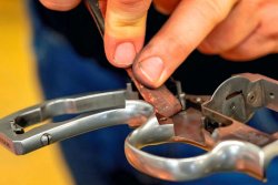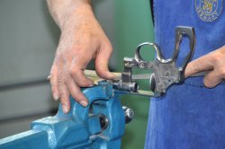Dabei staunten die Teilnehmer über manchen zunächst ruppig anmutenden Kniff der erfahrenen US-Tuner aus dem S & W Performance Center: Die zeigten, wie man mit einem zweckentfremdeten Abzugprüfgewicht die Hahnspannung einstellt (siehe Foto oben) und sie hämmerten auch schon mal beherzt mit einem als Puffer dienenden Bleiklotz auf eine bestimmte Stelle des 686-Rahmens, um so elegant und ohne Spuren die Schlossplatte herauszuhebeln. Im Ladenbetrieb, so rieten sie gleich dazu, sollte man dies tunlichst nicht so offen anwenden, damit es zuschauende Revolverbesitzer nicht unnötig erschreckt (Spoiler: keine Angst, es gibt garantiert keine Kratzer...)