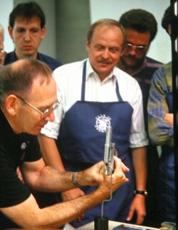 Doch der Reihe nach. Es begann bei dem heute von Karl Prommersberger (STP Sport Target Pistol) geleiteten Club auf Initiative des Westerwälder Ingenieurs Peter Abel. Der plante schon seit den 1970er Jahren, eine Vereinigung von Büchsenmachern zu gründen, die sich dem Überarbeiten vor allem der großrahmigen S & W-Revolver widmen wollten. Zwar gefiel dem hiesigen Fachhandel die Idee, US-Produkte umsatzfördernd auf deutschen Kundengeschmack abzustimmen. Aber in den USA spielte man auf Zeit. Nach langem Tauziehen gab es dort 1987 einen ersten Kurs, gefolgt 1991 von einem ersten fünftägigen Seminar in der Büchsenmacher-Fachschule in Ehingen, das auf Initiative der damaligen Firma Wischo zustande kam, die den S&W-Import nach Deutschland innehatte (gemeinsam mit dem Gummersbacher Großhändler AKAH):