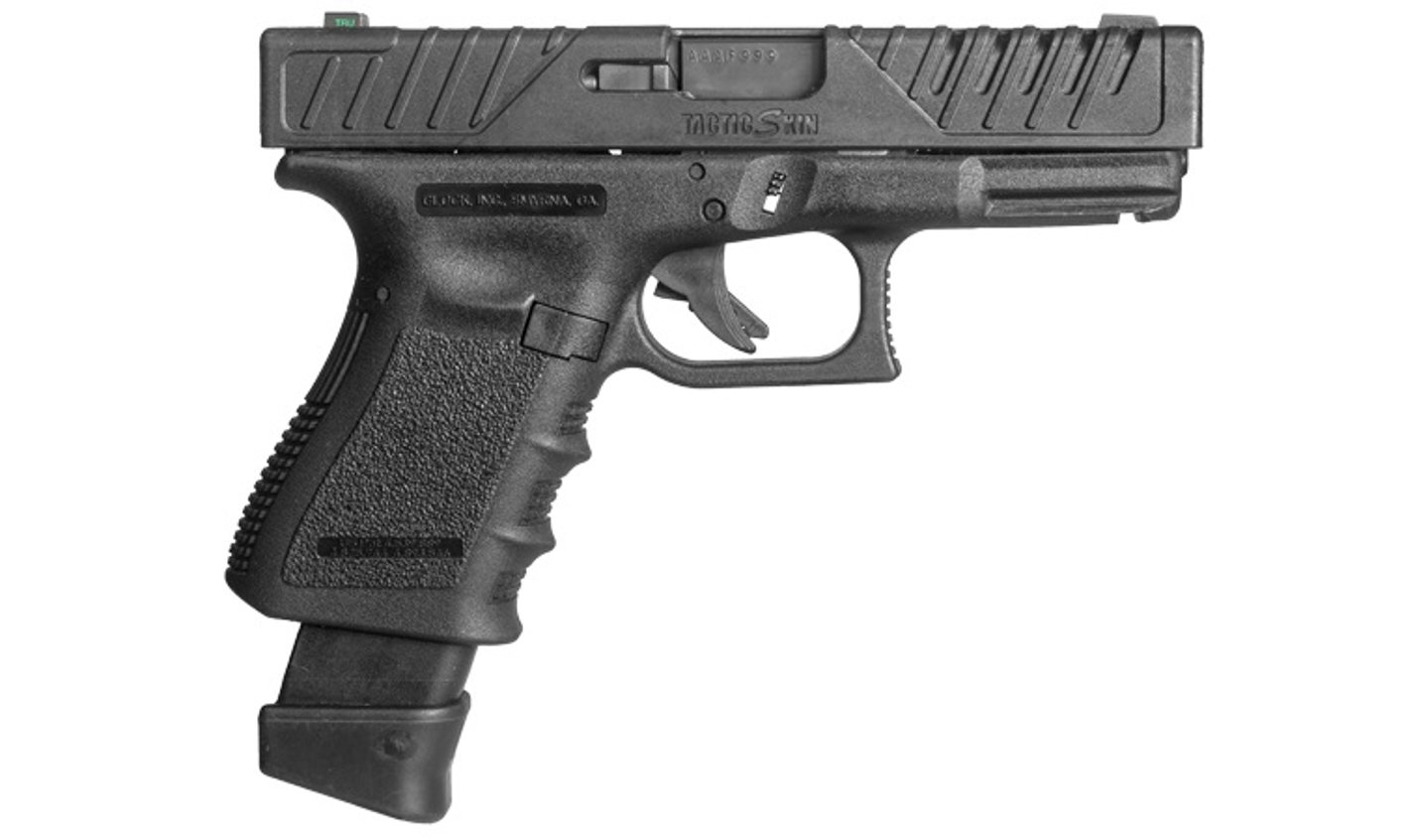 Für die GLOCK 17 und GLOCK 19 gibt es nun eine Abhilfe. TACTIC SKIN, ein Überzieher aus rutschfestem Polymer-Kunststoff, soll dieses Problem lösen.