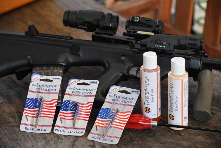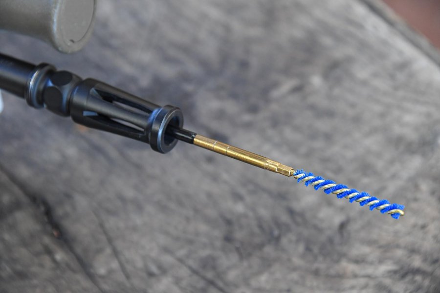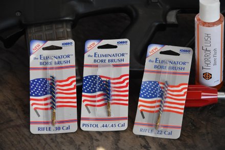 Ich habe es mit etwa 180 Schuss am ersten Tag und 250 am zweiten Tag verwendet. Am ersten Tag habe ich das Iosso ThorroClean Laufreinigungs-System und die Eliminator-Bürsten verwendet, und es überrascht nicht, dass ich einen sehr schönen und glänzenden Lauf erhielt. Ich folgte den Anweisungen auf dem Kit: mit dem Thorroflush Penetriermittel zuerst auf einem Patch (kleine, quadratische Baumwoll-Lappen) durchschieben und dann mit einem Dutzend Durchgänge mit dem ThorroClean Reinigungsmittel auf der Eliminator-Bürste, dann ein paar trockene Patches zum Reinigen und mit drei mit Thorroflush getränkten, nassen Patches beenden.