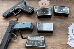 Gespeist wird der Laser von 3 LR626-Knopfzellen, deren Energie sicherlich für 5.000 bis 6.000 "Schuss" reichen dürfte. Gerade mit klassischen Spannabzugspistolen à la SIG Sauer P226 oder Revolvern können schnelle Folgeschüsse, Schussserien, Zielmedienwechsel trainiert werden. Bei Single Action-Pistolen wie COLT 1911 oder modernen Polymerrahmen-Schlagbolzenschloss-Dienstpistolen wie GLOCK 17 muss für Folgeschüsse der Hammer manuell vorgespannt bzw. der Schlitten durchrepetiert werden. Neuerdings wird aber speziell für die populären GLOCK-Pistolen der Gen3 bis Gen5 ein "Reset Trigger" offeriert. Bei dieser nur für das Trockentraining geeigneten Abzugseinheit mit einem Abzugsgewicht von knapp 2.300 g wird das Schloss nach jedem Schuss automatisch ohne lästiges, manuelles Repetieren des Verschlusses gespannt, so dass man auch mit dem österreichischen Bestseller schnelle Schussserien effektiv trainieren kann. Der Laser Ammo Reset Trigger kostet 219,- Euro. Im Trockentraining kann man natürlich auch einen Timer verwenden und gerade für dynamische Disziplinen ist die Laserpatrone beispielsweise für den Erstschuss nach dem Ziehvorgang, verschiedene Anschlagarten, Dot Drills, Schießen mit der schussstarken und schussschwachen Hand oder aus der Bewegung ein wertvolles Trainingstool. Das Basis-Set der Laser Ammo SureStrike Laserübungspatrone in 9 mm Luger kostet mit Batterie und drei reflektierenden Scheiben ab 139,- Euro, was unserer Meinung nach ein gut angelegtes Investment sind. Schön ist natürlich, dass man nicht mit ungewohnten und im Gewicht abweichenden Dummy-Waffen, sondern mit der eigenen, individuellen "Echten" und der entsprechenden Holsterausrüstung trainieren kann, was die Realitätsnähe nochmals steigert.