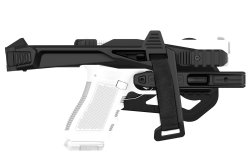 Der Recover 20/20N ist ein speziell für bestimmte Pistolenmodelle von GLOCK konzipierter Anschlagschaft aus glasfaserverstärktem Polymer mit anklappbarer Schulterstütze. Er ist speziell für GLOCK-Pistolen der Kaliber 9 mm, .357 SIG und .40 S&W mit doppelreihigen Magazinen sowie lizenzierten Nachbauten von Umarex konzipiert worden und soll die taktische Einsatzfähigkeit dieser Kurzwaffen erweitern. Dazu wird die Pistole in das vordere Teil des Anschlagschaft eingesetzt und mittels einer Klemmschraube im Bereich der Lampenschiene und des Abzugsbügels eingespannt, nach hinten stützt sich die Pistole mit dem Griffhorn am Stabilizer ab. Die Verbindung über die Weaver-Schiene am Dustcover und den Abzugsbügel gewährleisten einen sicheren Halt und absolut wackelfreien der Waffe. Der Einbau ist in weniger als einer Minute zu bewerkstelligen. Den dazu erforderlichen Innensechskantschlüssel (5/32") liefert der israelische Hersteller gleich mit, alternativ passt hier aber ein 4 mm Inbus. Am vorderen Ende des Anschlagschafts befinden auf beiden Flanken zwei kurz Pica Rails auf der 3- und 9-Uhr-Position. Ein weitere Picatinny-Schiene sitzt unterhalb der Klemmschraube unmittelbar vor dem Abzugsbügel auf der 6-Uhr-Position. Damit verfügt der Recover 20/20 Stabilizer über hinreichend Schnittstellen zur Aufnahme von taktischem Zubehör. An der Rail auf 6-Uhr kann beispielsweise der im großen Set enthaltene MG9-Frontgriff mit integriertem Magazinhalter montiert werden. Richtig: In dem Zusatzgriff kann ein zweireihiges Glock-Magazin griffbereit verstaut werden. Darüber hinaus lässt sich die Waffe mit dem zusätzlichen Griff für die Nichtschusshand natürlich noch besser stabilisieren. Der MG9-Frontgriff kann sekundenschnell werkzeuglos, durch Eindrücken einer Federtaste an seine linken Seite auf die Rail geschoben werden. Wird die Taste losgelassen, raste eine Sperrklinke in einer der Nuten an der Schiene ein. Die Klinke fällt leider sehr kurz und auch etwas schmal aus, was dem Griff ein leichtes Längsspiel auf der Schiene verleiht. Wenn der Schütze die Waffe beim Schießen den Anschlagschaft fest in die Schulter zieht, stört das aber nicht weiter.